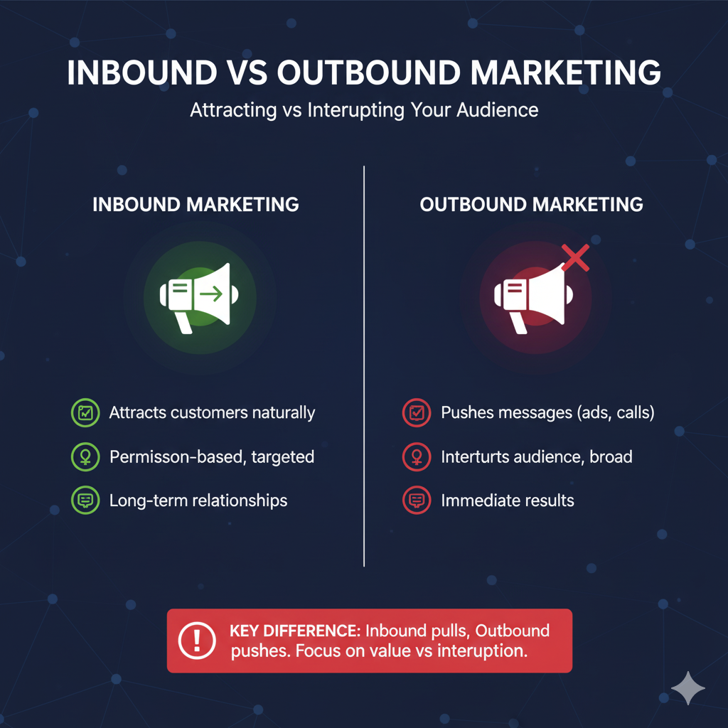 - Outbound Marketing: Pushes messages through ads, cold emails, or calls. It interrupts the audience, is broader in reach, and focuses on immediate results.