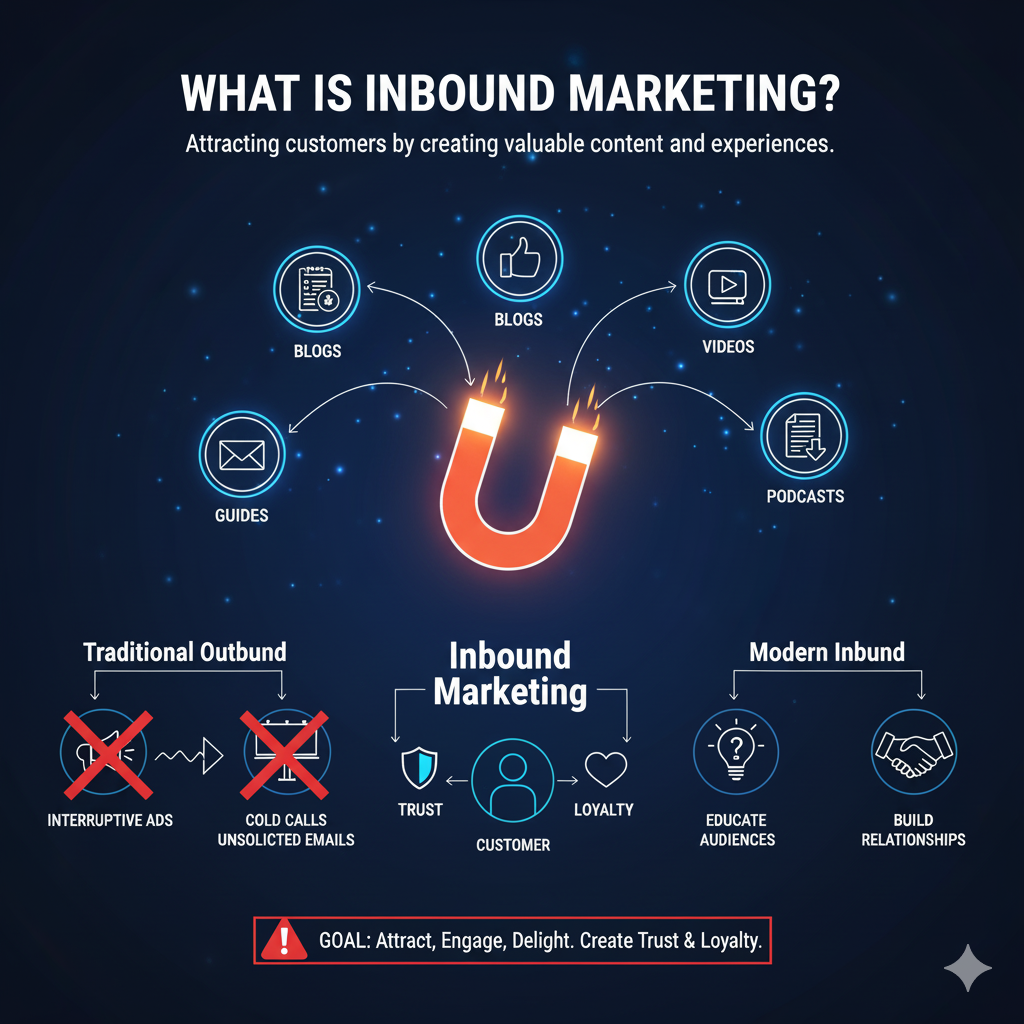Inbound marketing is a strategy where businesses draw potential customers toward their brand by offering relevant, helpful, and engaging content. Unlike outbound marketing, which interrupts people with advertisements, cold calls, or unsolicited emails, inbound marketing pulls audiences in naturally by addressing their needs, solving problems, and educating them.