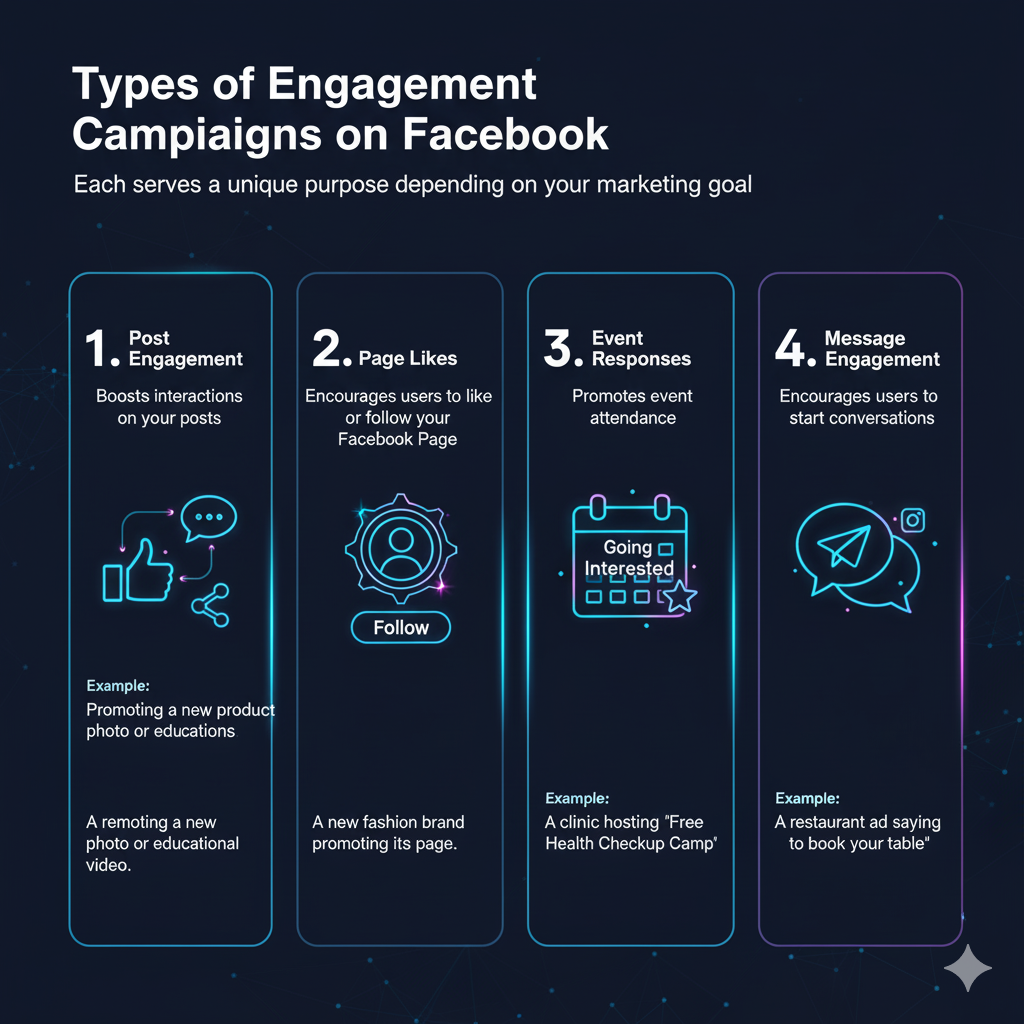 A Facebook Engagement Campaign is a type of ad objective designed to encourage people to interact with your content — such as liking your post, commenting, sharing, clicking “Follow,” or sending a message.