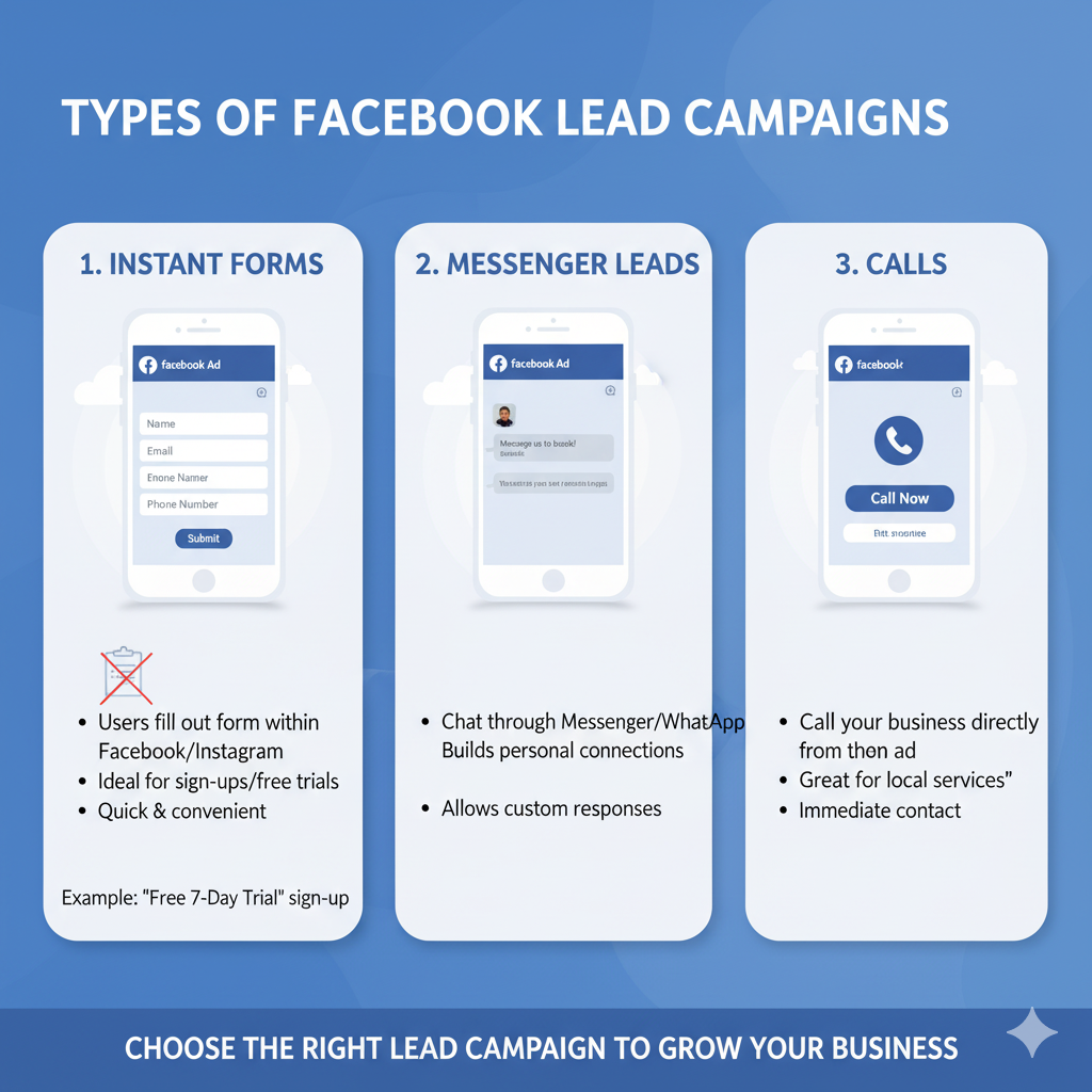 A Facebook Lead Campaign is an ad objective designed to collect customer data within Meta’s ecosystem. When this objective is selected, Facebook optimizes ad delivery to reach users most likely to fill out your form or start a conversation with your business.