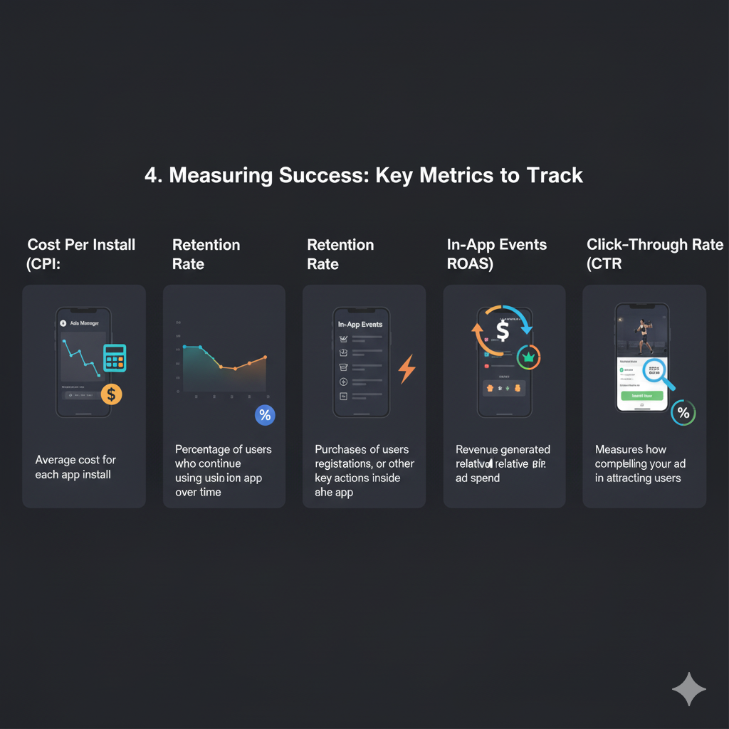 - Track measurable KPIs, such as Cost Per Install (CPI), in-app purchases, and retention rates.
