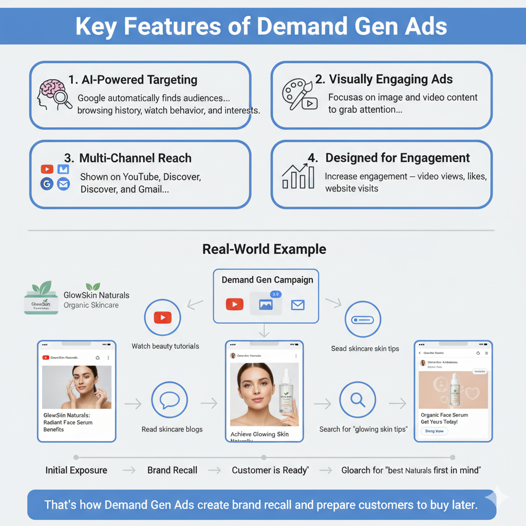 Unlike search ads, which focus on clicks and conversions, Demand Gen aims to increase engagement — such as video views, likes, and website visits.