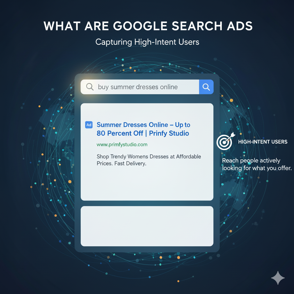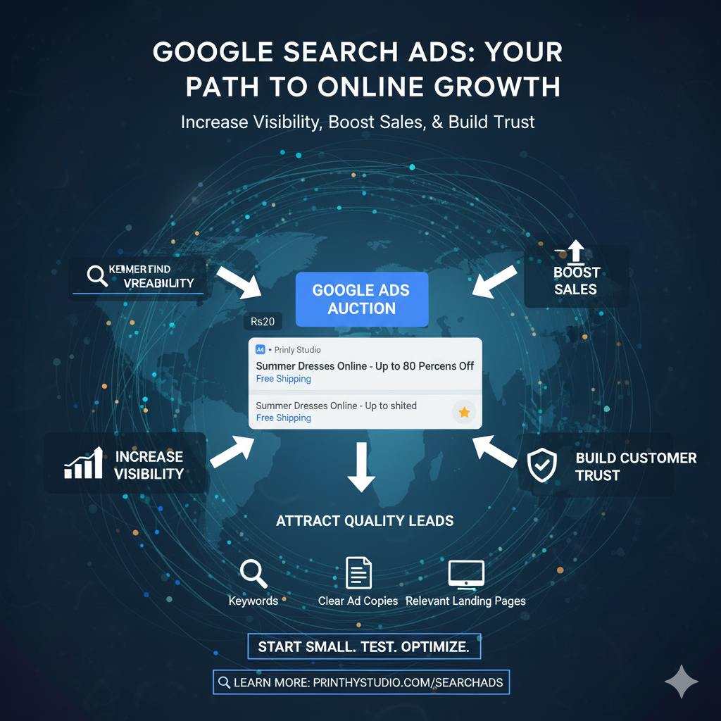 Google Search Ads are one of the most effective ways to promote your business online. They help you reach people who are already searching for what you offer. For a growing brand like Prinfy Studio, Search Ads can increase visibility, boost sales, and build customer trust.