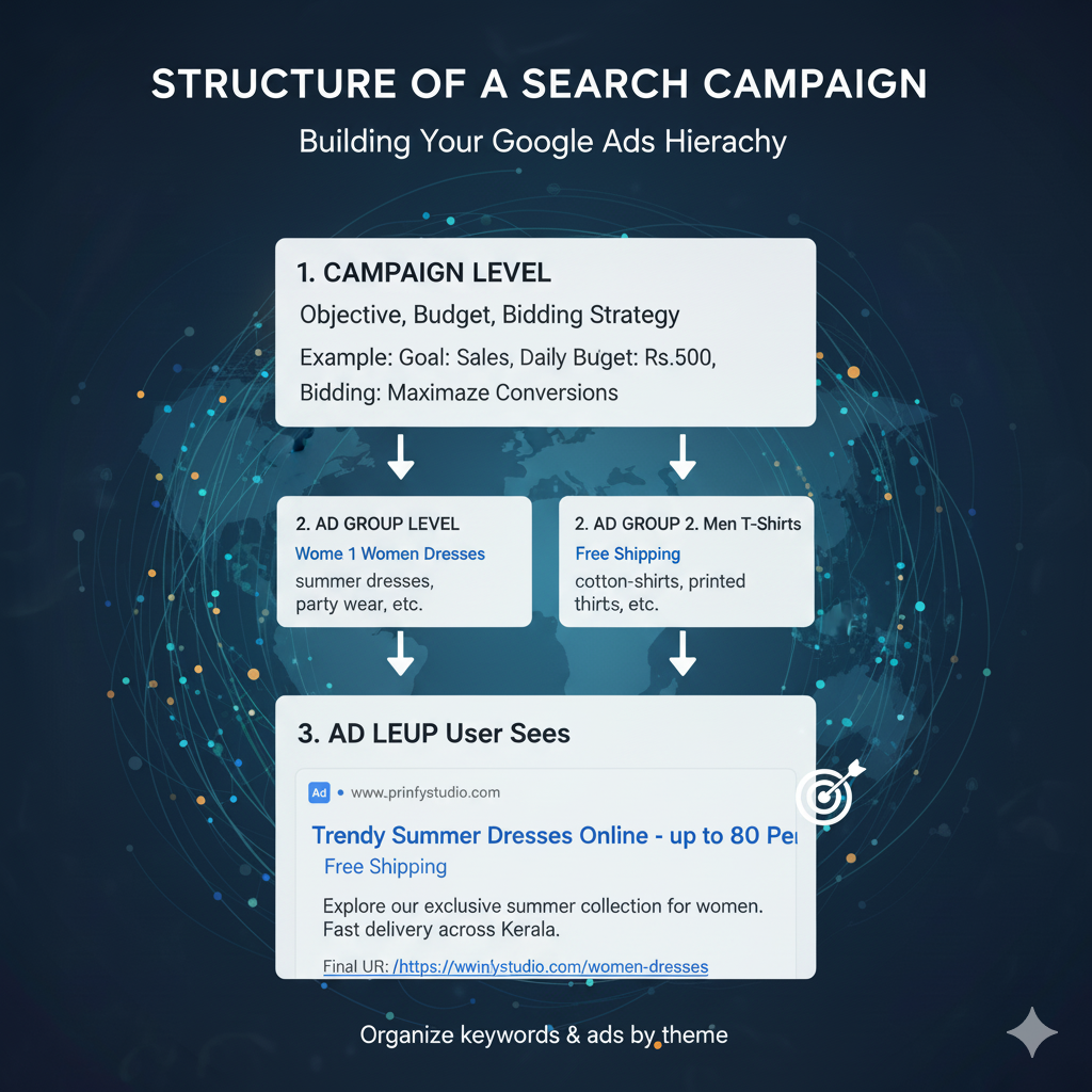 - Ad Group 1: Women Dresses (keywords: summer dresses, party wear, etc.)