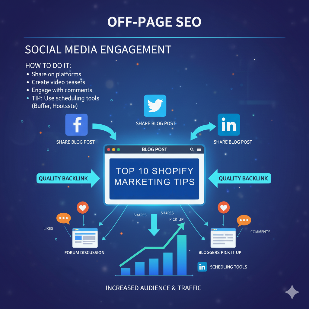 You publish a blog Top 10 Shopify Marketing Tips. You post a short tip on LinkedIn with a link. People engage, share, and some bloggers pick it up and link to your full post.
