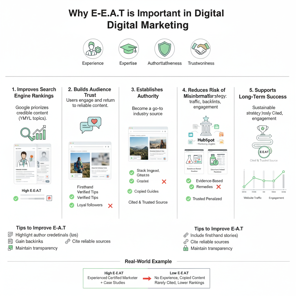 Digital marketing is no longer just about creating content and hoping it ranks. Google has become increasingly sophisticated in evaluating content quality and website credibility. One of the most important frameworks guiding this evaluation is E-E-A-T, which stands for Experience, Expertise, Authoritativeness, and Trustworthiness. Understanding and applying E-E-A-T is essential for improving search engine rankings, especially for sites dealing with sensitive topics like health, finance, or law, often referred to as YMYL (Your Money or Your Life) topics.