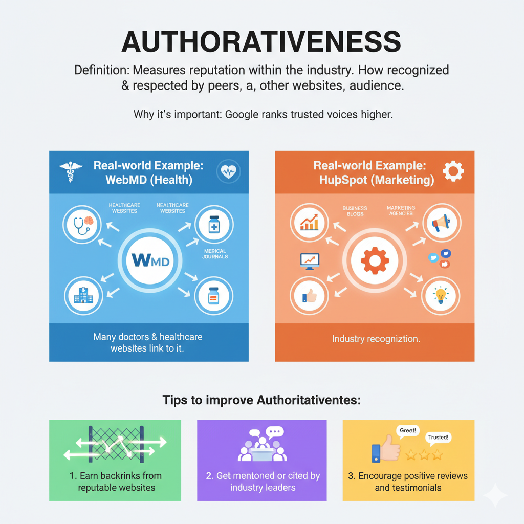 Definition: Authoritativeness measures the reputation of the content creator or website within the industry. It’s about how recognized or respected you are by peers, other websites, or your audience.