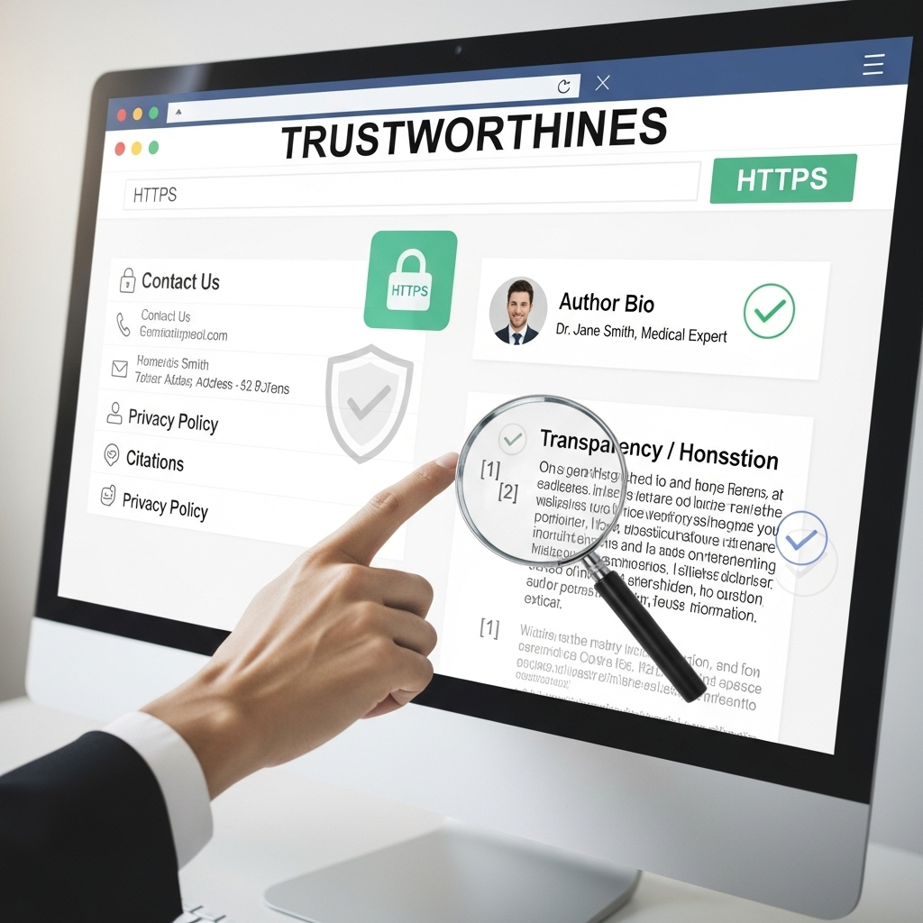 - Websites with HTTPS, clear contact info, privacy policies, and verified authors are considered trustworthy.