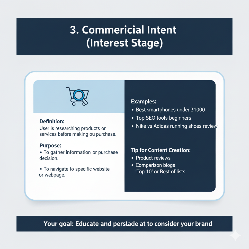 Commercial intent means the user is researching products or services before making a purchase. They want to compare options and read reviews before deciding.