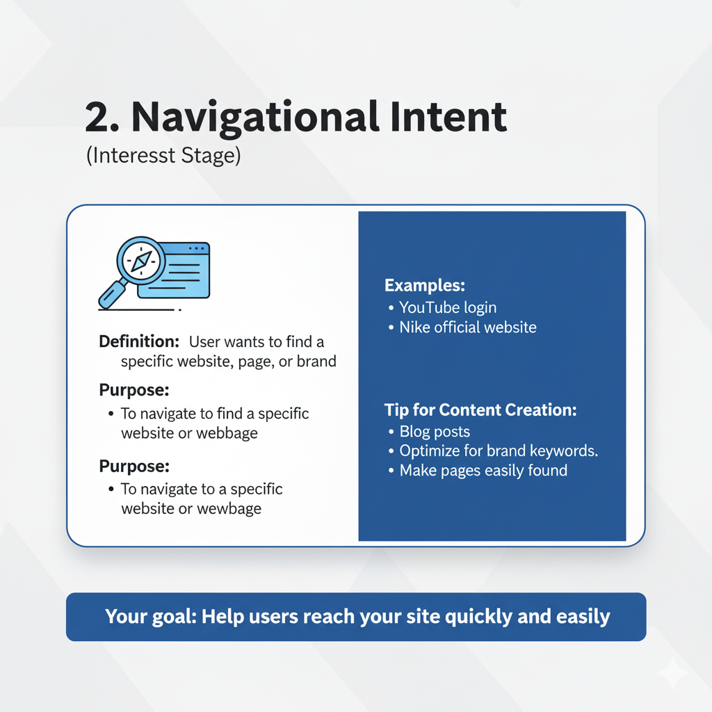 Navigational intent means the user wants to find a specific website, page, or brand. They already know what they are looking for and just want to reach that destination.