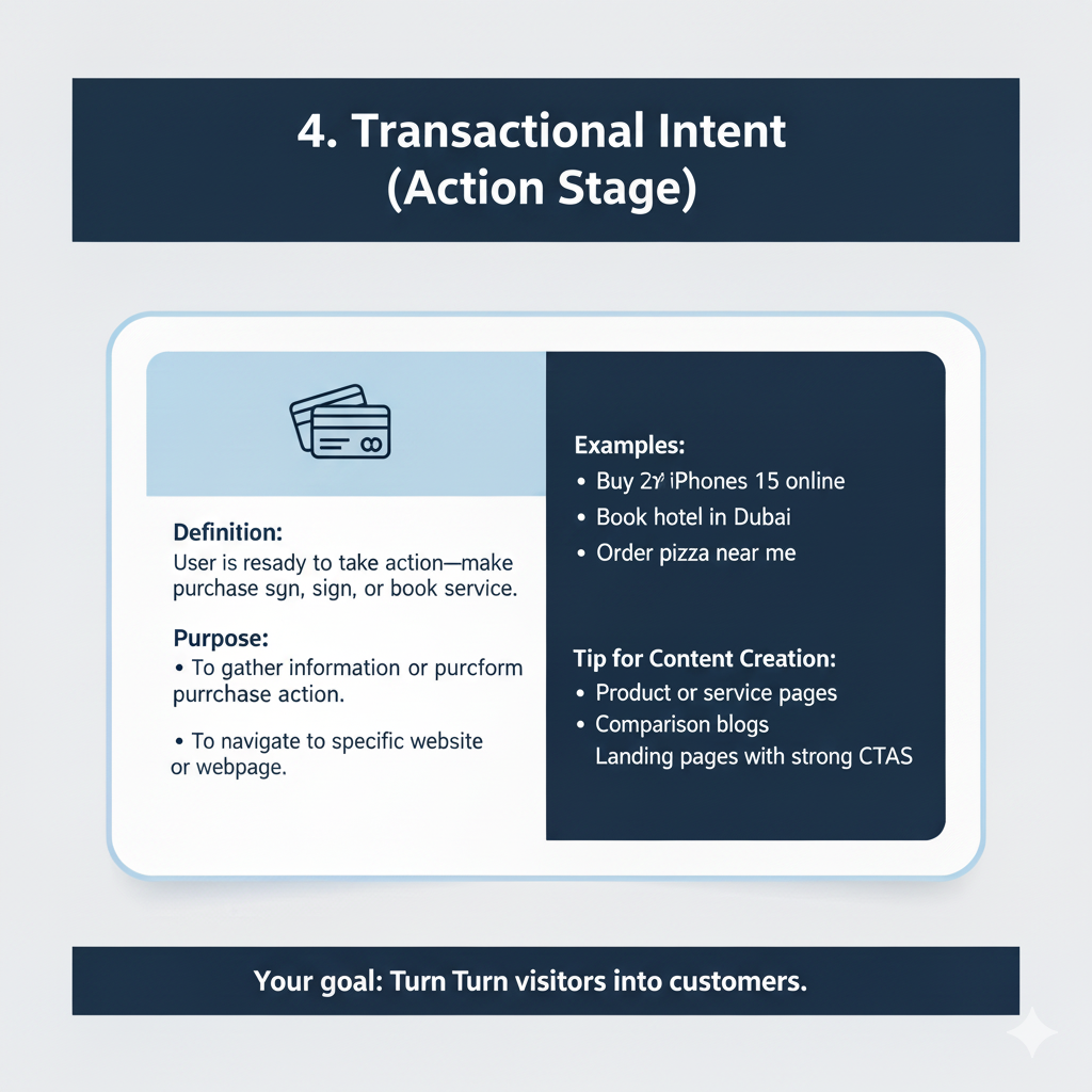 Transactional intent means the user is ready to take action — usually to make a purchase, sign up, or book a service.