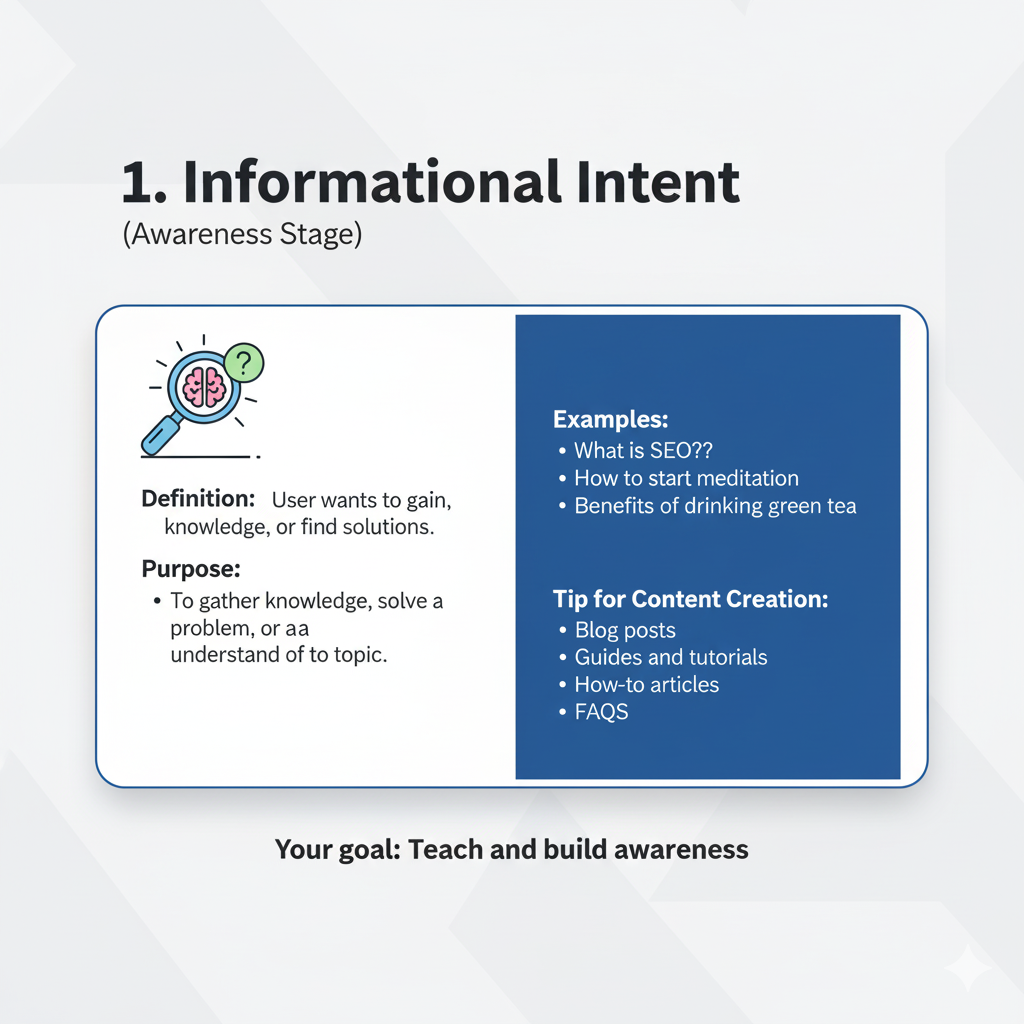 Informational intent means the user wants to learn something or gain knowledge. They are not looking to buy — they just want information, explanations, or solutions.